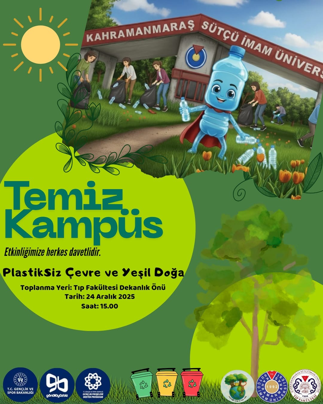 GSB Gönüllülük Projeleri Destekleme Çağrısı kapsamında desteklenen PlastikSiz Çevre ve Yeşil Doğa projesinin ilk etkinliği 24 Aralık 2025 tarihinde Saat 15:00'da Tıp Fakültesi Dekanlığı önünde "Çöp Adamın İsyanı" isimli oyun ile başlayacak ve ardından kampüsümüzde temizlik çalışması yapılacaktır.