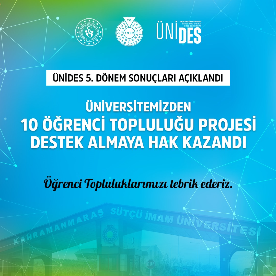 Kahramanmaraş Sütçü İmam Üniversitesi (KSÜ) öğrencileri, Gençlik Hizmetleri Genel Müdürlüğü tarafından yürütülen Üniversite Öğrenci Toplulukları İş Birliği ve Destek Programı (ÜNİDES)’in 5. Döneminde önemli bir başarıya imza attı. KSÜ’den 10 öğrenci topluluğu projesi, yapılan değerlendirme sonucunda destek almaya hak kazandı.