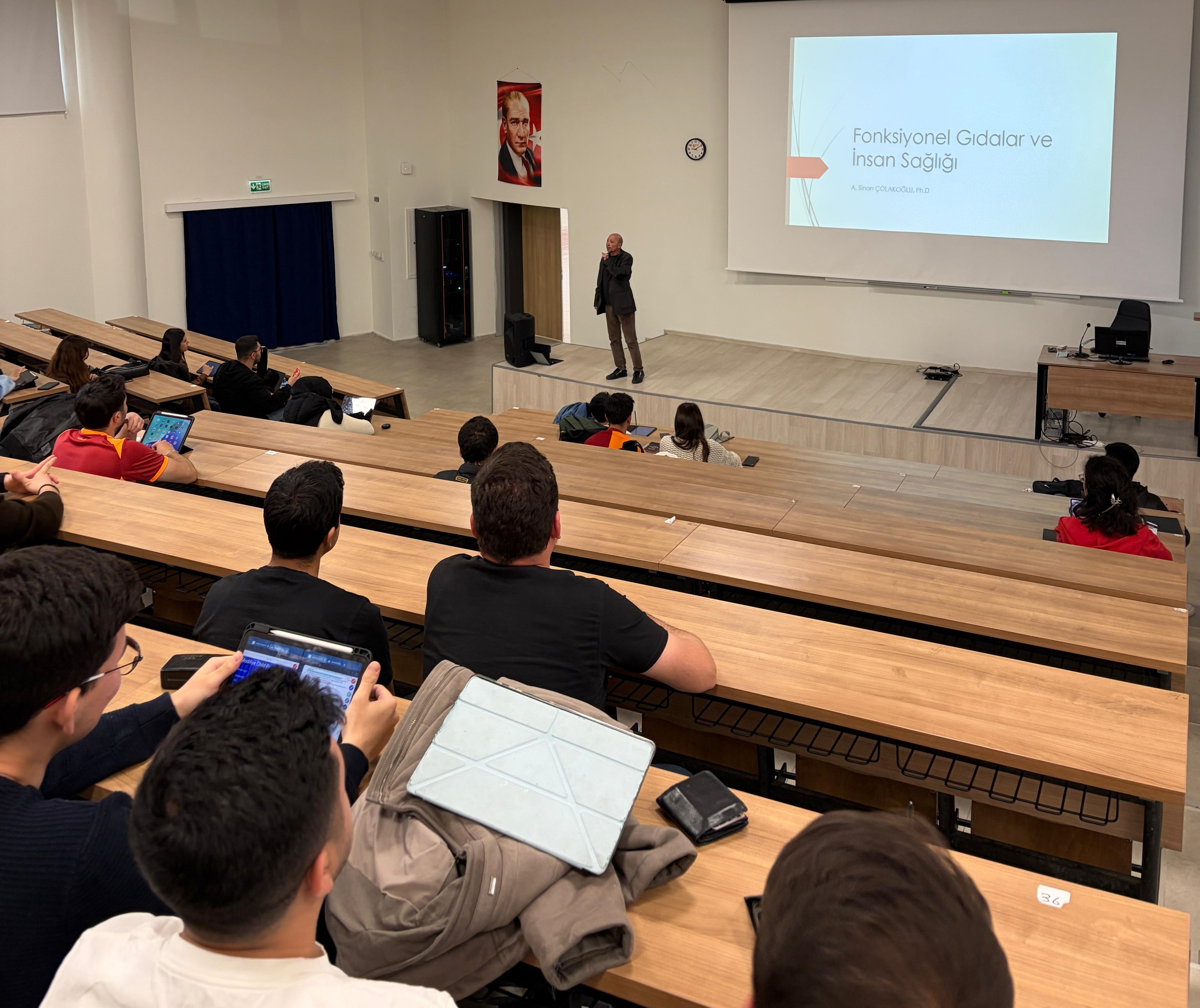 Tıp Fakültesi amfi bloklarında gerçekleştirilen etkinlikte, Gıda Mühendisliği Bölümü öğretim üyesi Dr. Öğr. Üyesi Abdullah Sinan Çolakoğlu tarafından “Fonksiyonel Gıdalar ve İnsan Sağlığı” başlıklı bir ders sunuldu. Etkileşimli olarak gerçekleştirilen derste fonksiyonel gıdaların insan sağlığı üzerindeki etkileri ve sağlığın korunmasındaki rolleri ele alındı.