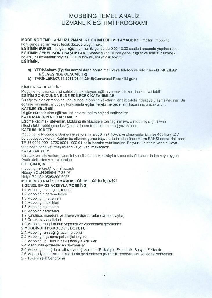 Mobbing İle Mücadele Derneği Duyurusu: Mobbing Temel Analiz Uzmanlık Eğitimi