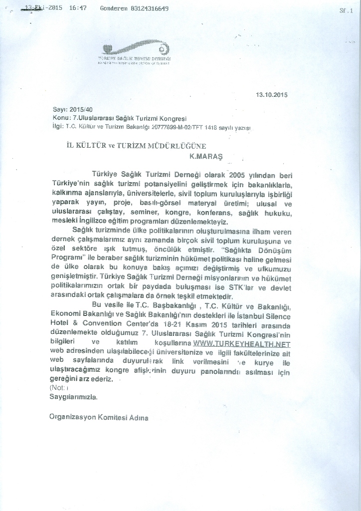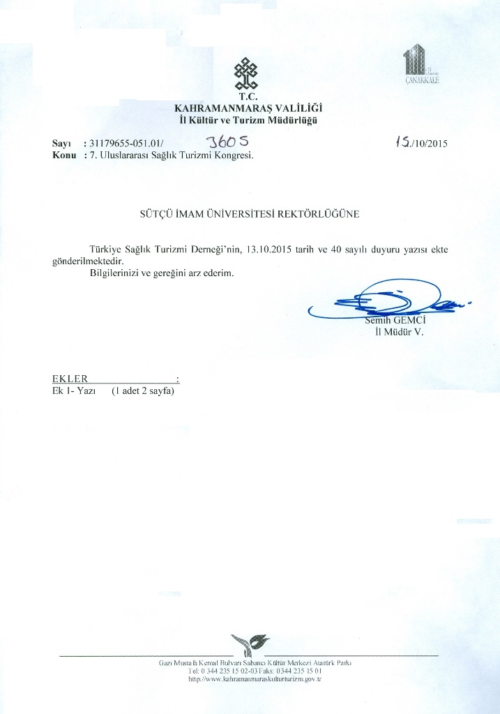 Kahramanmaraş İl Kültür ve Turizm Müdürlüğü Duyurusu: 7. Uluslararası Sağlık Turizmi Kongresi