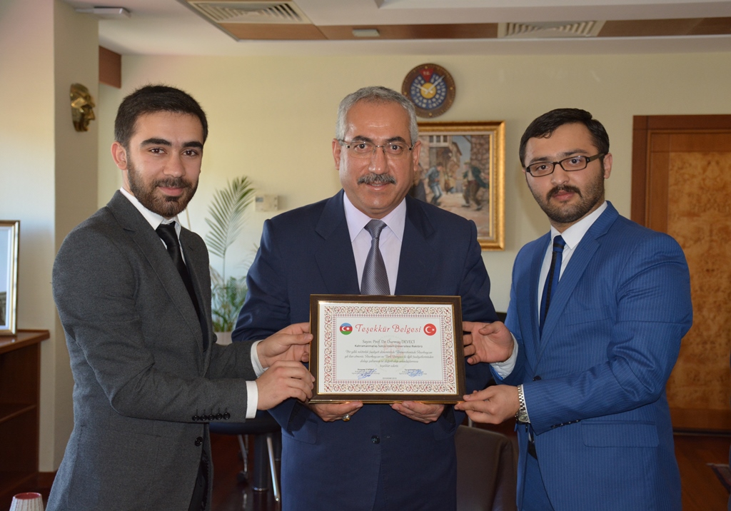 Rektör Deveci’nin Rektörlük görevinin birinci yılı dolayısıyla gerçekleştirilen ziyarette dernek üyeleri, Rektör Deveci’nin 2015 yılını KSÜ ve Azerbaycan Üniversiteleri işbirliği ve dostluk yılı ilan etmesi ve Türk Dünyası ile ilgili faaliyetlerinden dolayı teşekkür etti. Dernek üyeleri Azerbaycan halkı, üniversitemizde eğitim gören Azerbaycanlı öğrenciler ve Kahramanmaraş’ta ikamet eden Azerbaycan vatandaşları adına Rektör Prof. Dr. Durmuş Deveci’ye teşekkür belgesi takdim ettiler.
