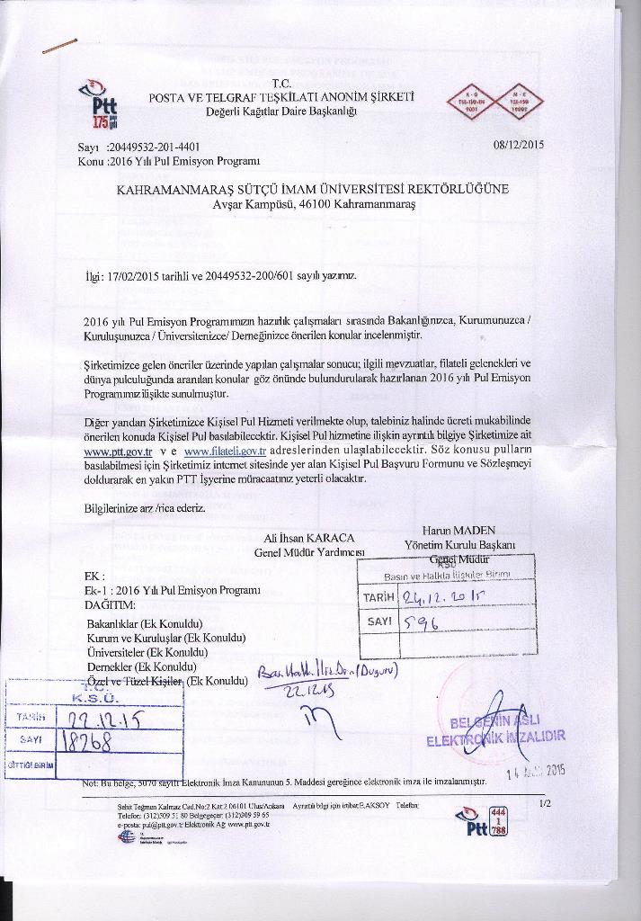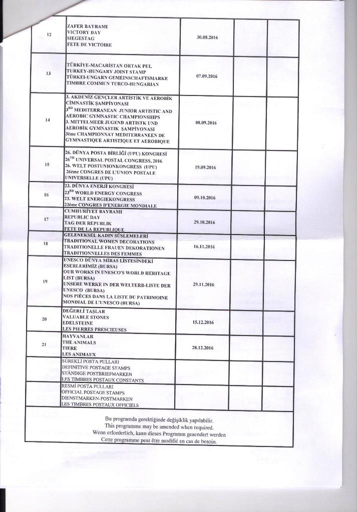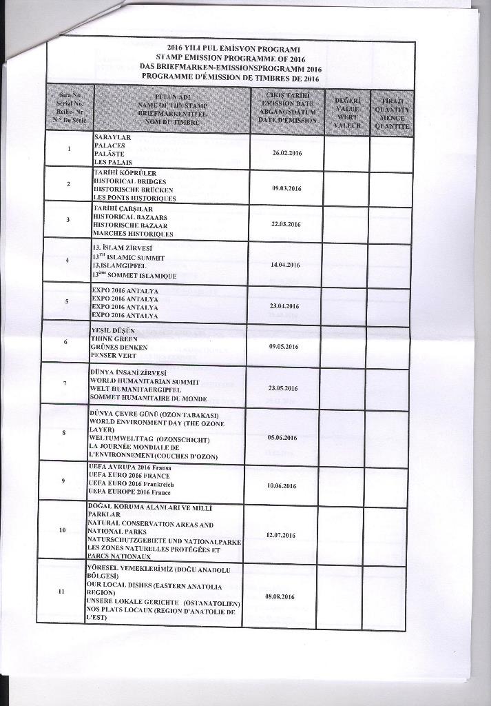 Posta ve Telgraf Teşkilatı Duyurusu:2016 Yılı Pul Emisyon Programı