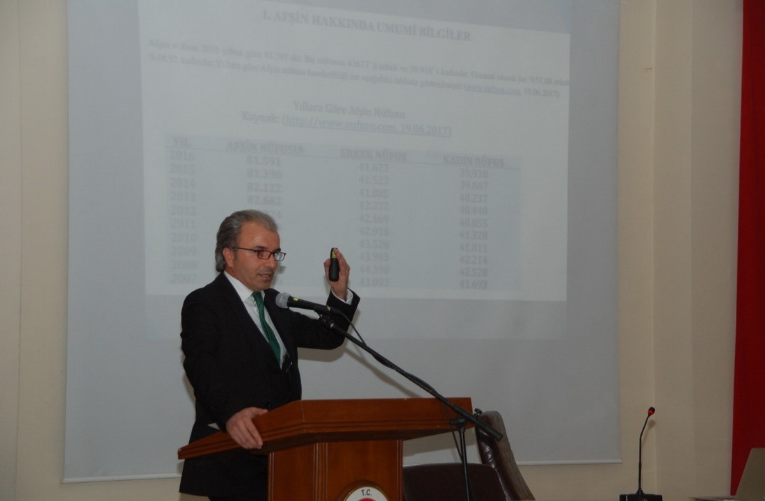 Kahramanmaraş Sütçü İmam Üniversitesi (KSÜ) Afşin Meslek Yüksekokulu (MYO) akademik personeli tarafından yürütülen “Afşin’de Yaşam, Yaşam Doyumu ve Göç Algısı” ve “Afşin Kamu Kuruluşlarında İş Sağlığı ve Güvenliği" çalışmaları, Afşin Kaymakamlığının düzenlediği bir toplantı ile Afşin’de bulunan tüm daire amirlerine ve sivil toplum örgütlerine sunuldu.