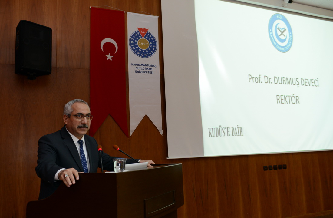 KSÜ Senem Ayşe Konferans Salonunda gerçekleştirilen programın açılış konuşmasını Rektör Prof. Dr. Durmuş Deveci yaptı. Bütün Ümmet-i Muhammed’in bizlerden beklentileri var diyen Rektör Deveci, “Kudüs’ü hak eden bir bilince, Kudüs’ü hak eden bir ahlaka ulaştığımızda Kudüs bizim olacaktır.” şeklinde konuştu.