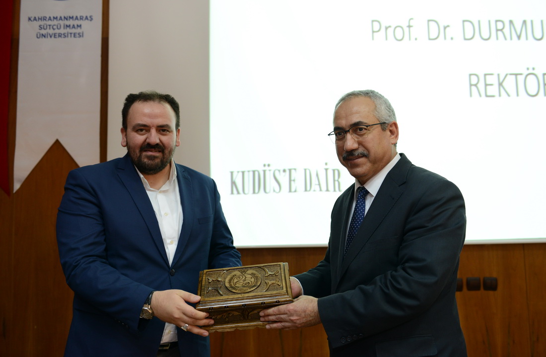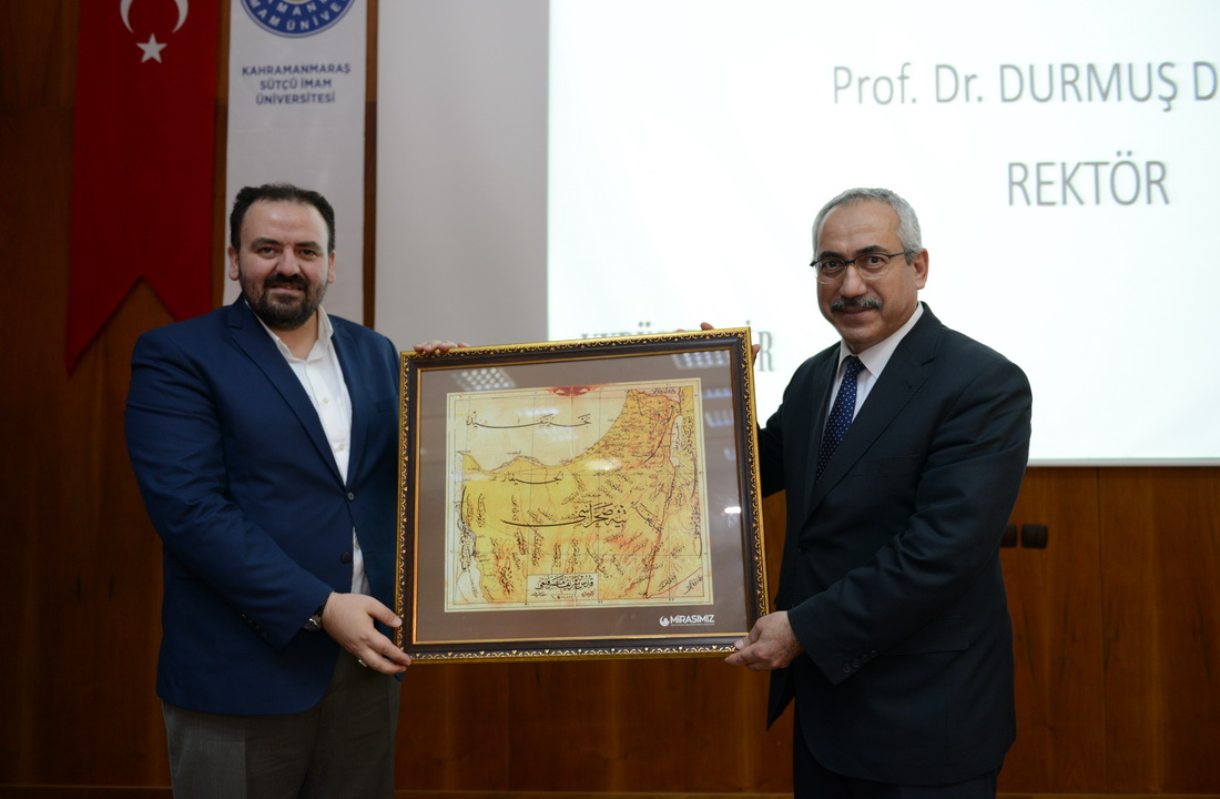 Açılış konuşmasının ardından Mirasımız Derneği Yönetim Kurulu Başkanı Muhammet Demirci tarafından Rektör Deveci’ye Kudüs Mutasarrıflığının haritasının yer aldığı tablo hediye edildi. Rektör Deveci de Muhammet Demirci’ye Kahramanmaraş’ın önemli el sanatlarından oyma ceviz sandık hediye etti.