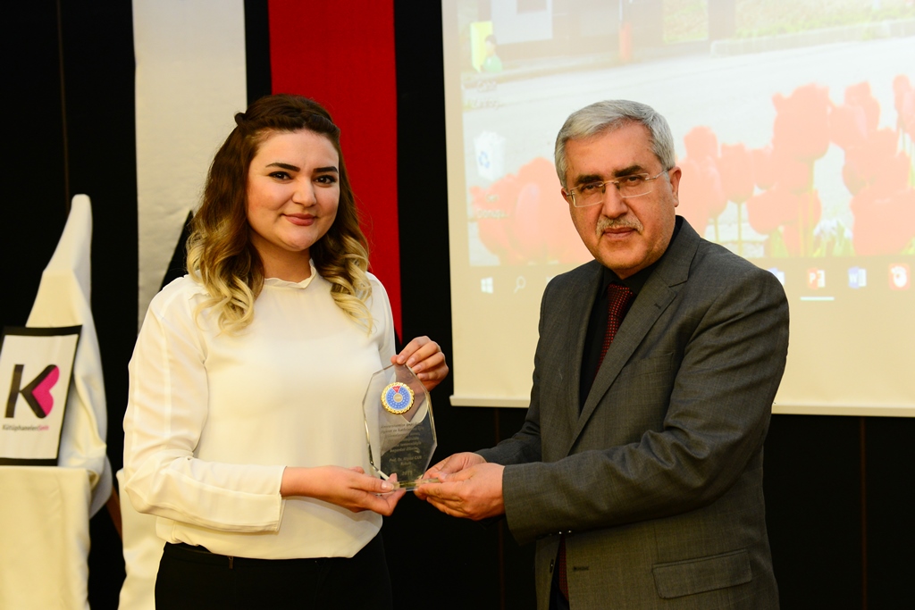 Rektör Can tarafından etkinlikte sunumlarıyla yer alan Seçil Ak ve Gökçe Değirmenci’ye plaket takdim edilirken Kütüphane ve Dokümantasyon Daire Başkanı Mehmet Bilmen tarafından da Öğr. Gör. Alper Şakalar’a hediye verildi.