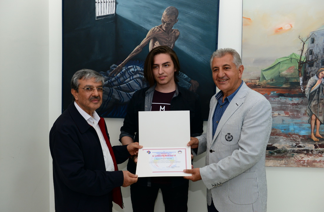 Açılış konuşmalarının ardından Rektör Yardımcısı Prof. Dr. İbrahim Taner Okumuş ve protokol üyeler sergiyi gezerekken, GSF Üniversite Öğrencileri İçin 16. Resim Yarışmasında dereceye giren ve sergilenmeye değer görülen eser sahiplerine katılım belgelerini takdim edildi.