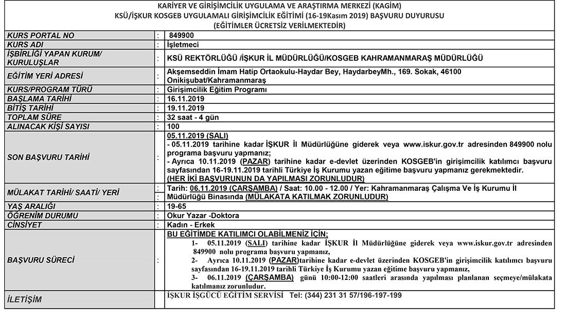 KAGİM-KSÜ/İŞKUR KOSGEB Uygulamalı Girişimcilik Eğitimi (16-19 Kasım 2019) Başvuru Duyurusu