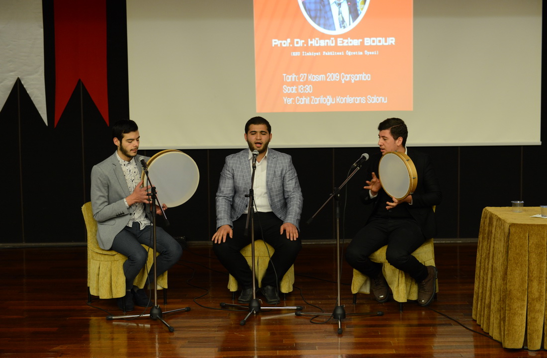 KSÜ Cahit Zarifoğlu Konferans Salonunda Rektör Yardımcıları Prof. Dr. Zekeriya Pak ve Prof. Dr. Kadir Saltalı, İlahiyat Fakültesi Dekanı Prof. Dr. Mehmet Akif Özdoğan, Fen-Edebiyat Fakültesi Dekanı Prof. Dr. Orhan Doğan, Genel Sekreter Prof. Dr. Fatih Tiyek, akademisyenler ve öğrencilerin katılımıyla gerçekleştirilen program tasavvuf musikisi dinletisi ile başladı.