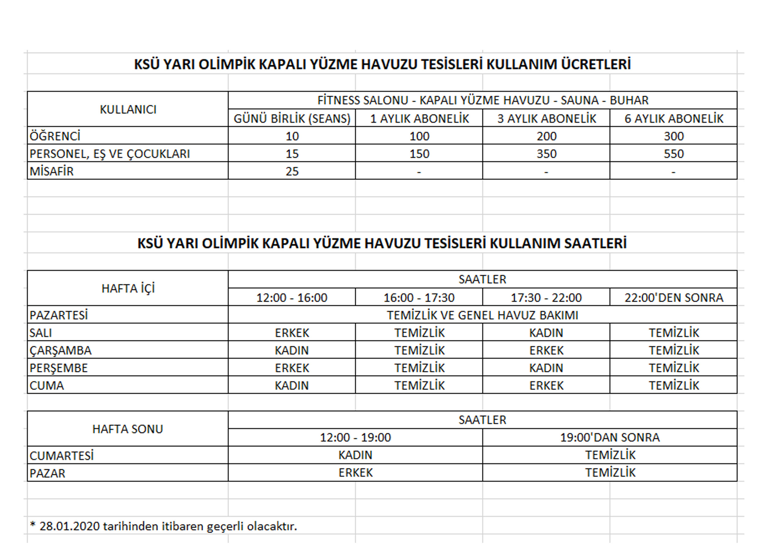 KSÜ Yarı Olimpik Kapalı Yüzme Havuzu Tesisleri Kullanım Ücretleri ve Saatleri