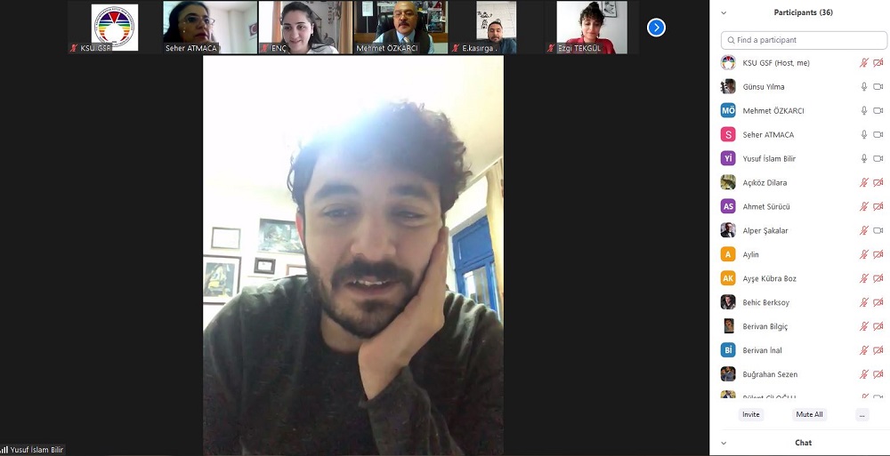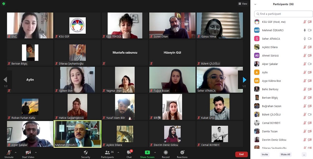 Kahramanmaraş Sütçü İmam Üniversitesi Güzel Sanatlar Fakültesi Dekanı Prof. Dr. Mehmet ÖZKARCI, Öğretim Elemanları ve Müzik Bölümü öğrencilerinin katılımıyla, 2020-2021 Eğitim-Öğretim yılı Bahar yarıyılının ilk toplantısı, 3 Mart 2021 Çarşamba günü saat 12:00’de ZOOM üzerinden gerçekleştirildi. Dekan ÖZKARCI, öğrencilere sürecin nasıl ilerlediğini, yapılan derslerde sıkıntı yaşayıp yaşamadıklarını sordu. Öğrenciler yapılan derslerde hiçbir sıkıntı yaşamadıklarını ancak hocalarını ve üniversiteyi özlediklerini dile getirdiler. Öğrenciler bir araya gelmekten çok mutlu oldukları ifade ettiler. Dekan ÖZKARCI, öğrencilerimizle online üzerinden sohbet programlarının devam edeceğini belirterek, programa katılan hocalara ve öğrencilere teşekkür etti.