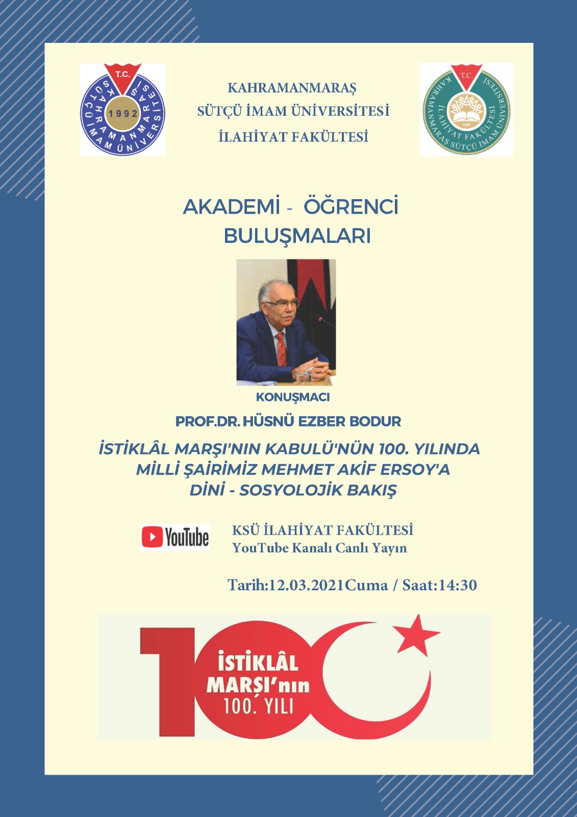 Akademi-Öğrenci Buluşmalarında Bu Hafta Konuşmacı: Prof Dr. Hüsnü Ezberbodur İstiklal Marşı'nın Kubulü'nün 100. Yılında Milli Şairimiz Mehmet Akif Ersoy'a Dini-Sosyolojik Bakış Konusuyla İlahiyat Youtube Kanalında