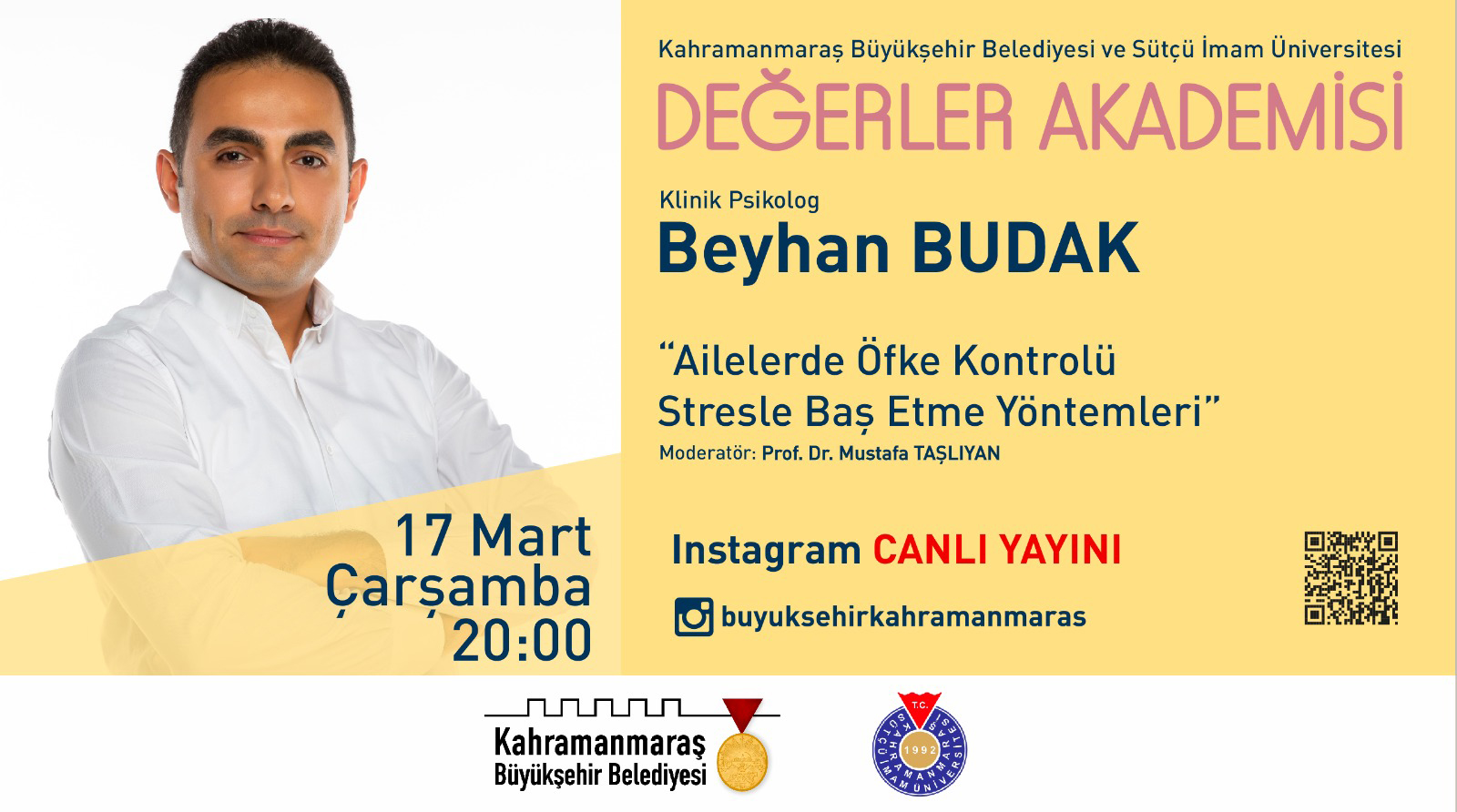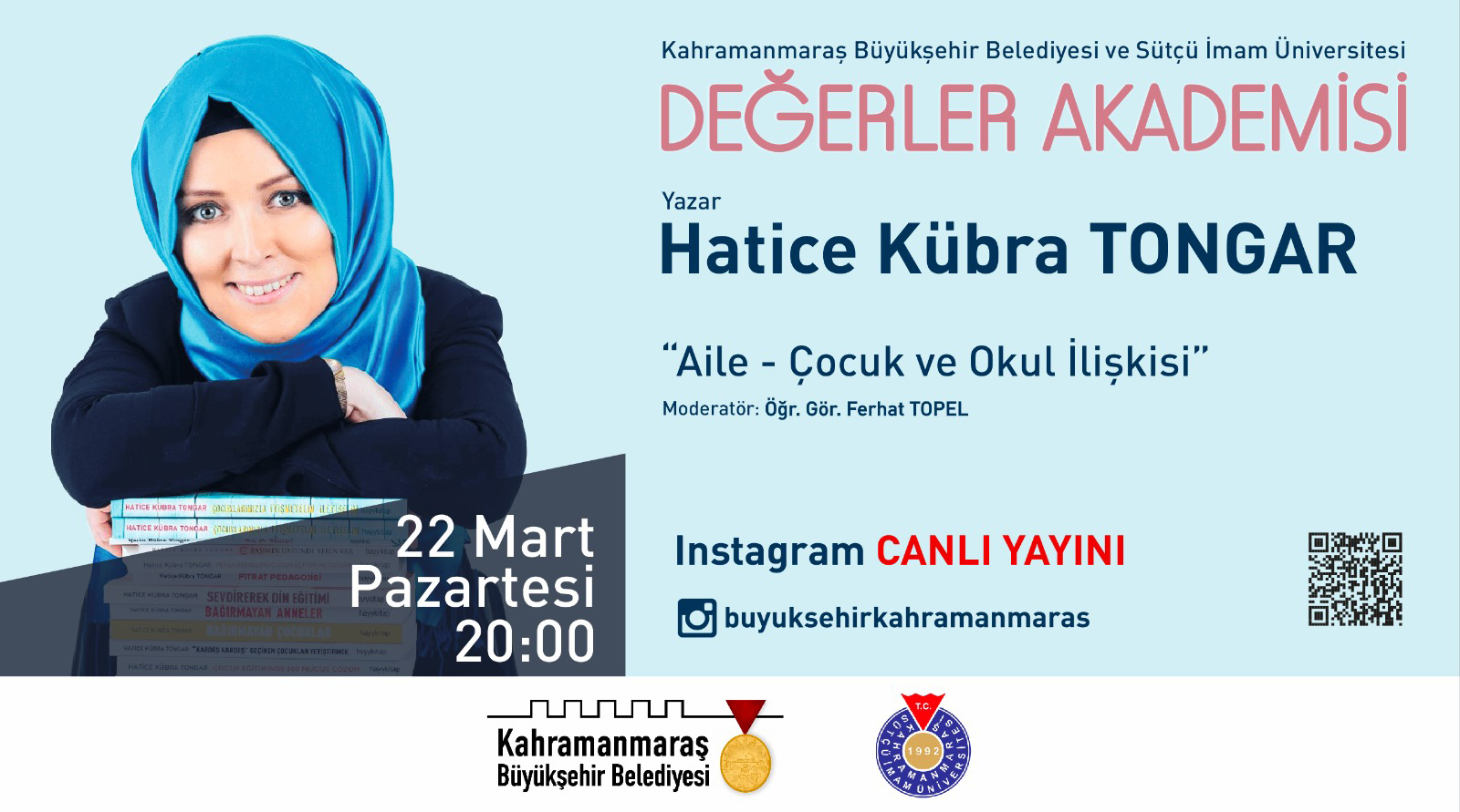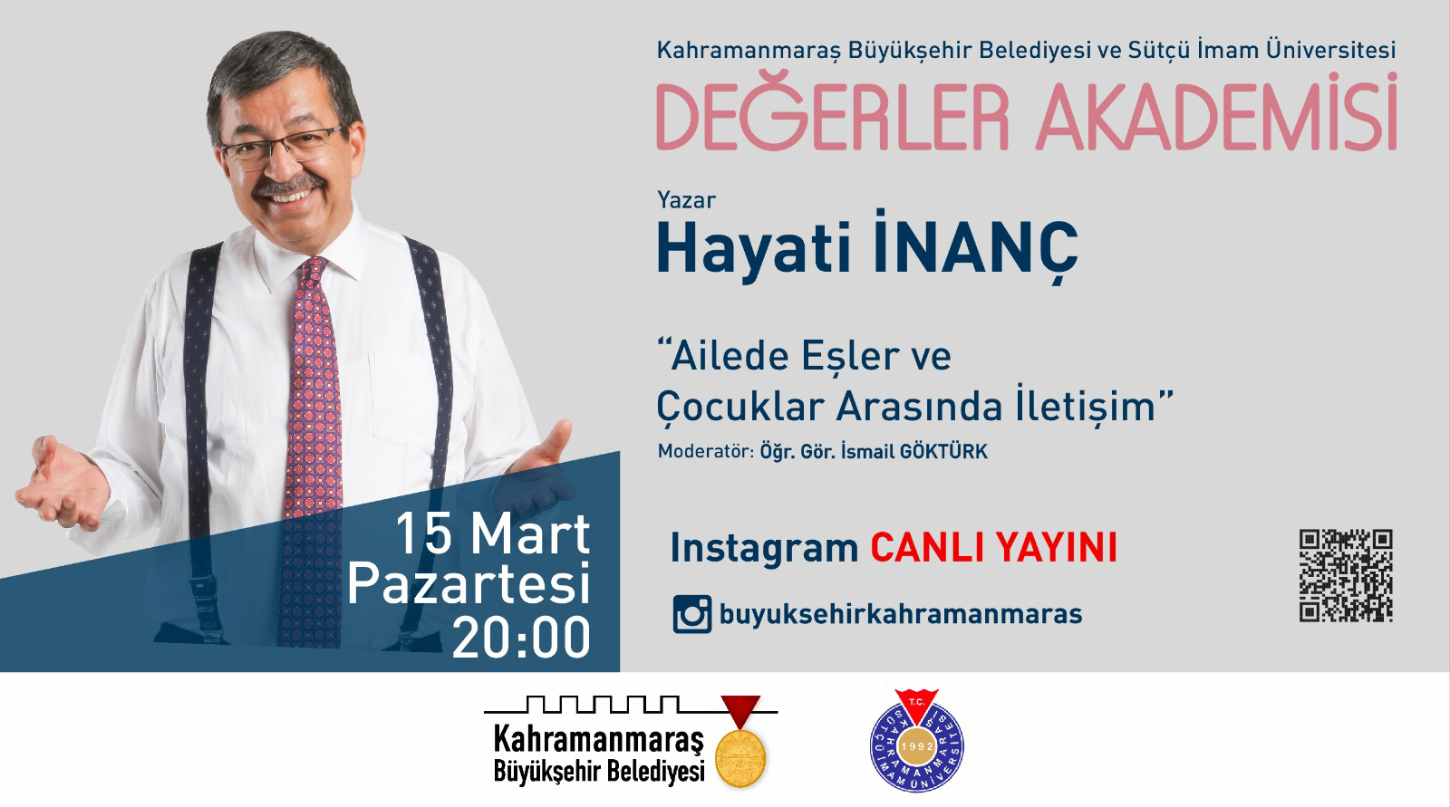 Kahramanmaraş Sütçü İmam Üniversitesi İİBF Sosyal Hizmet Bölümü ve Kahramanmaraş Büyükşehir Belediyesi Sağlık ve Sosyal Hizmetler Daire Başkanlığı Kadın ve Aile Şube Müdürlüğü ortaklığında ailenin güçlendirilmesi, ailede sorunların azaltılması ve kadına yönelik şiddet konusunda farkındalık oluşturmak amacıyla aileyi ilgilendiren önemli başlıklarda sosyal medya üzerinden "Değerler Akademisi Seminerleri" düzenlenecektir.