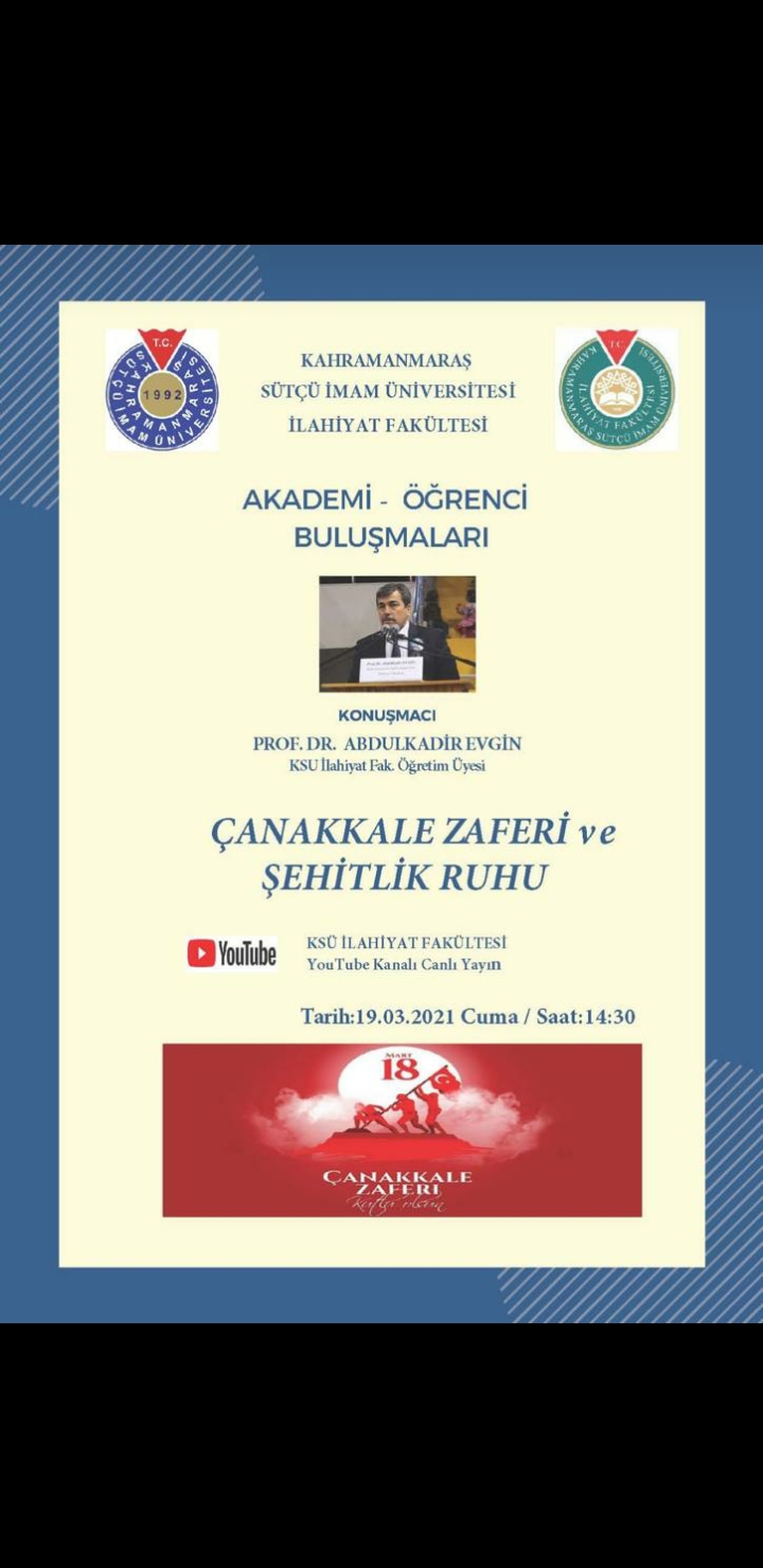 Akademi-Öğrenci Buluşmalarında Bu Hafta Konuşmacı: Prof Dr. Abdülkadir EVGİN "Çanakkele Zaferi ve Şehitlik Ruhu" Konusuyla İlahiyat Youtube Kanalında