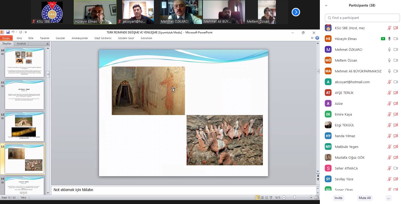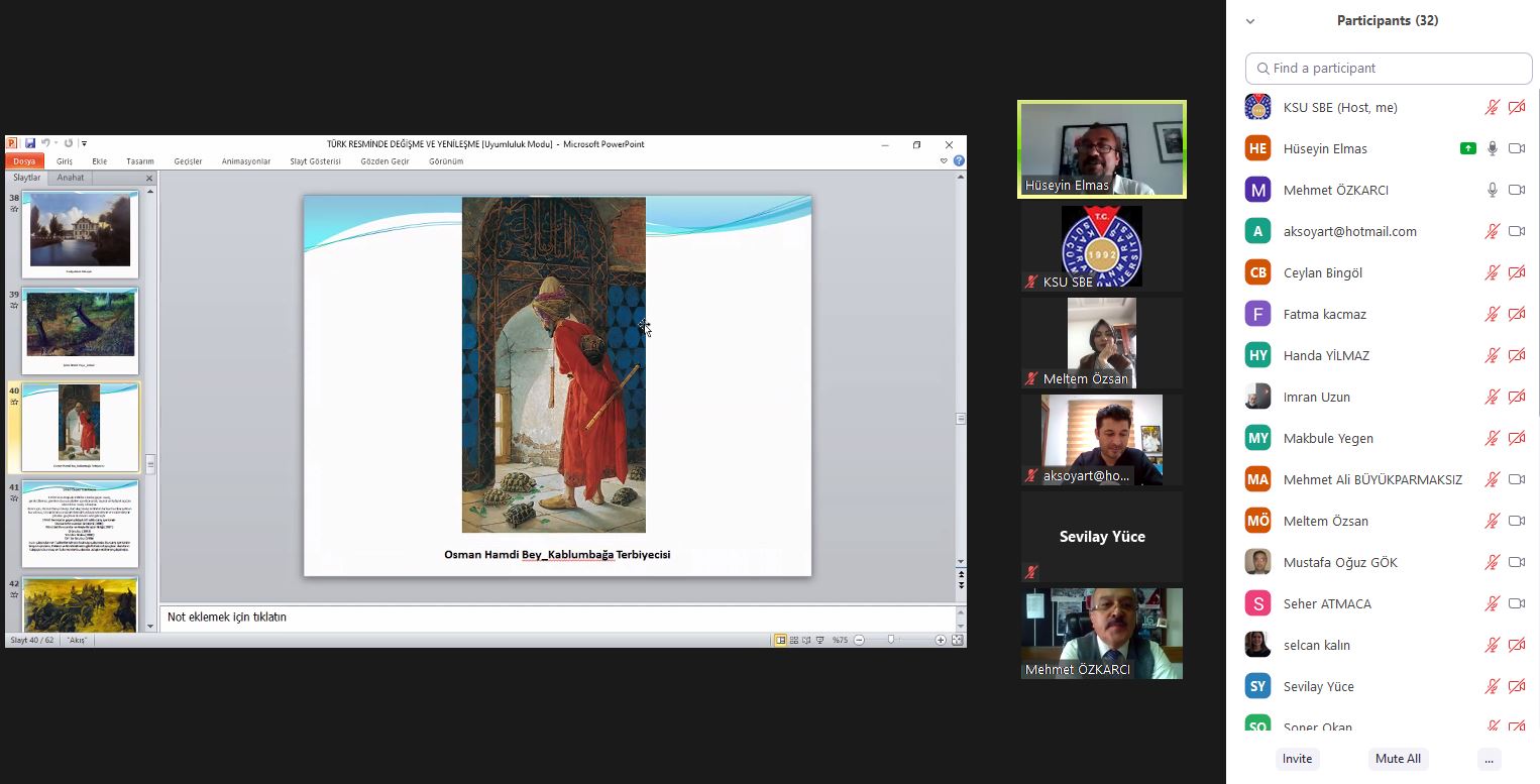 Kahramanmaraş Sütçü İmam Üniversitesi Güzel Sanatlar Fakültesi olarak “Türk Resminde Değişme Ve Yenileşme” konulu online konferans 25 Mart 2021 Perşembe günü saat: 14:00’da gerçekleştirildi. Konferansın konuşmacısı Gazi Üniversitesi, Eğitim Fakültesi, Resim-İş Eğitimi Anabilim Dalı öğretim üyesi Prof. Dr. Hüseyin ELMAS,konferansın moderatörlüğünü ise Güzel Sanatlar Fakültesi Dekanı Prof. Dr. Mehmet ÖZKARCI yaptı. Online konferansa öğretim elemanları ve öğrencilerin yanı sıra pek çok misafir katıldı. Konferansın sonunda katılımcıların sorularını cevaplayan Prof. Dr. Hüseyin ELMAS, bu nazik davet için Dekanı Prof. Dr. Mehmet ÖZKARCI’ya teşekkür etti.