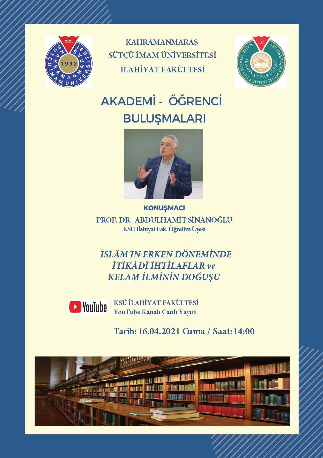 Akademi-Öğrenci Buluşmalarında Bu Hafta Konuşmacı: Prof Dr. Abdülhamit SİNANOĞLU "İslam'ın Erken Döneminde İtikadi İhtilaflar ve Kelam İlminin Doğuşu" Konusuyla İlahiyat Youtube Kanalında