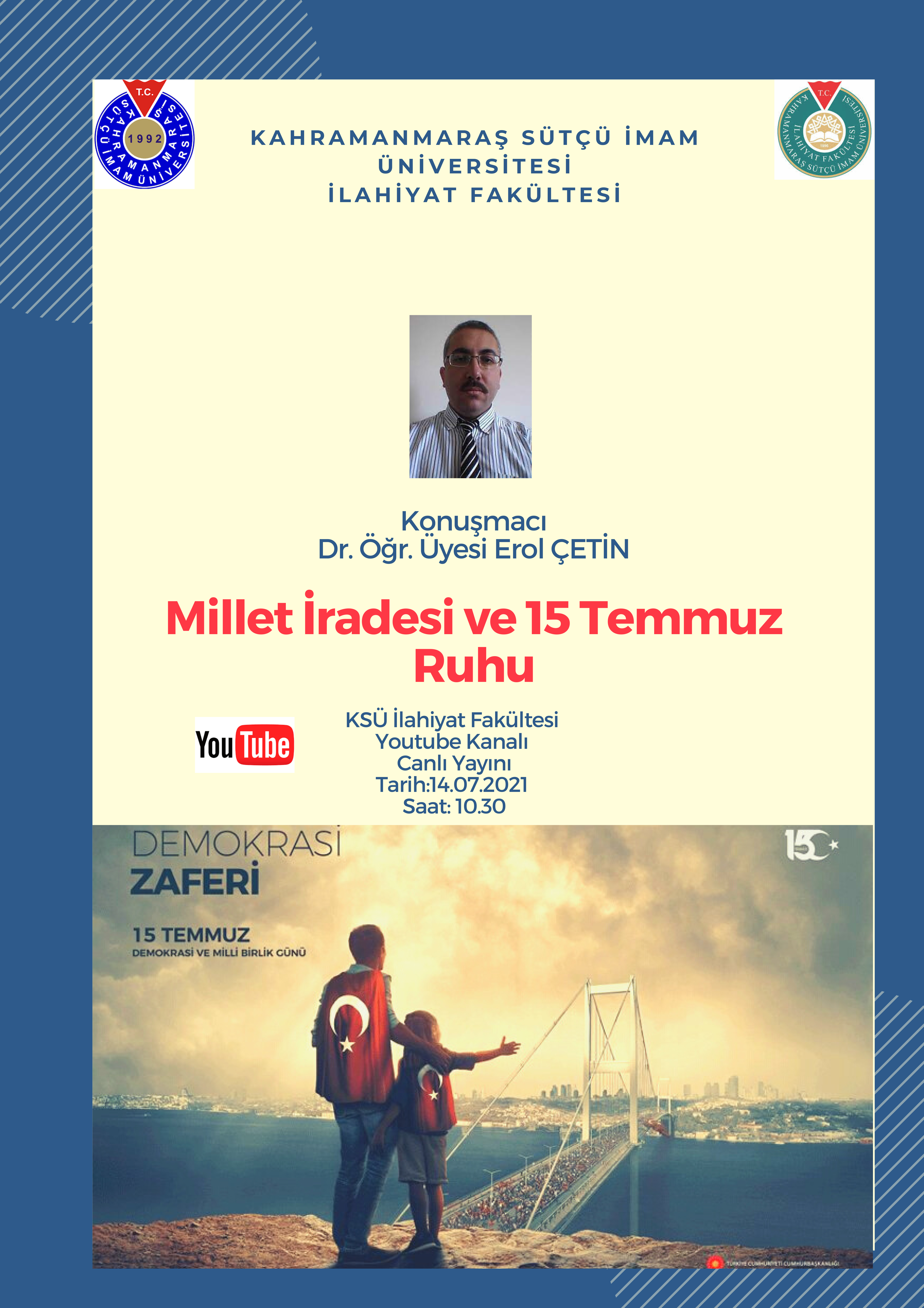 KSÜ İlahiyat Fakültesi Youtube Kanalı Canlı Yayınında (14.07.2021-10:30) "Millet İradesi ve 15 Temmuz Ruhu" Konusuyla Dr. Öğr. Üyesi Erol ÇETİN sizlerle olacak
