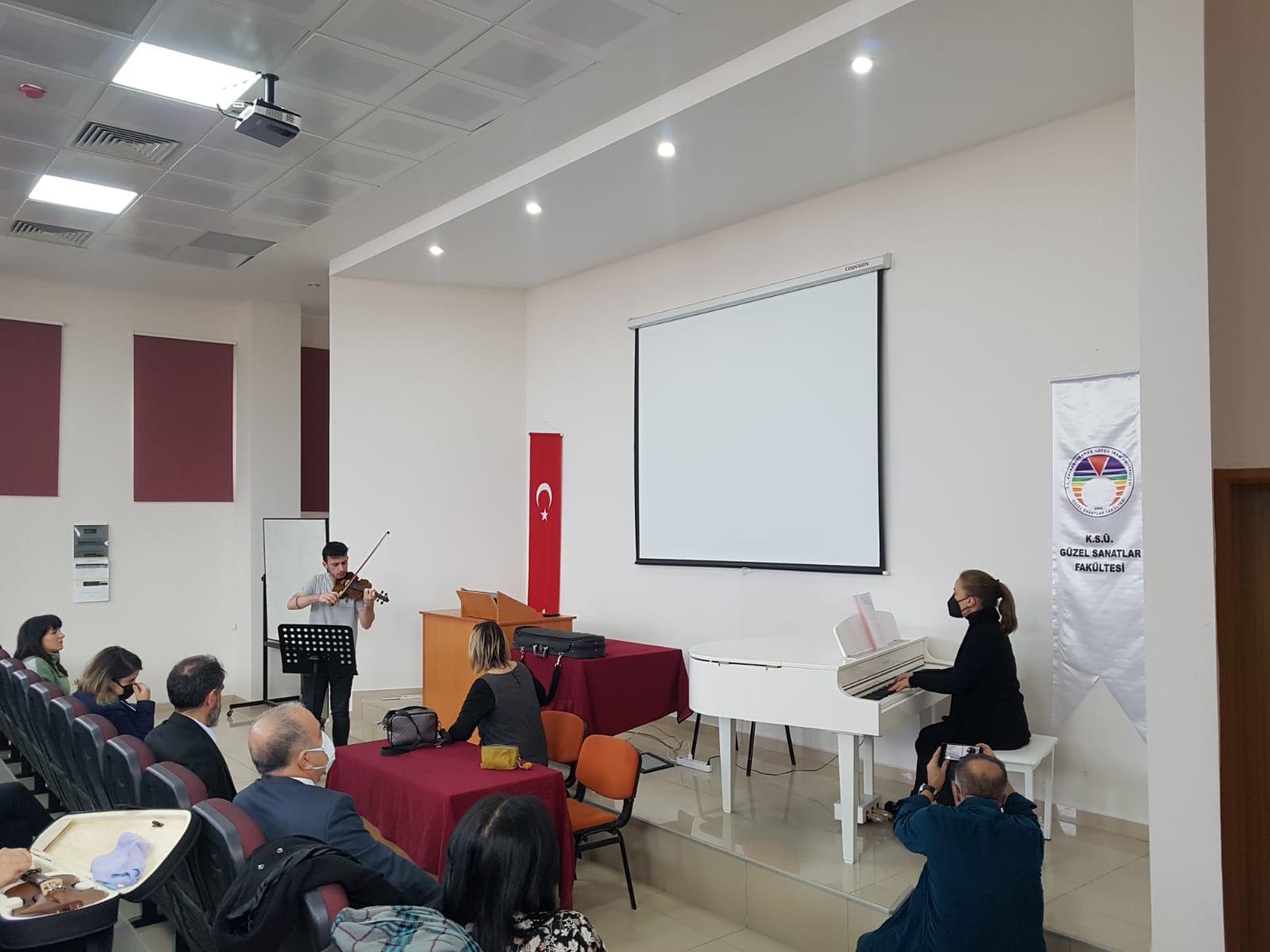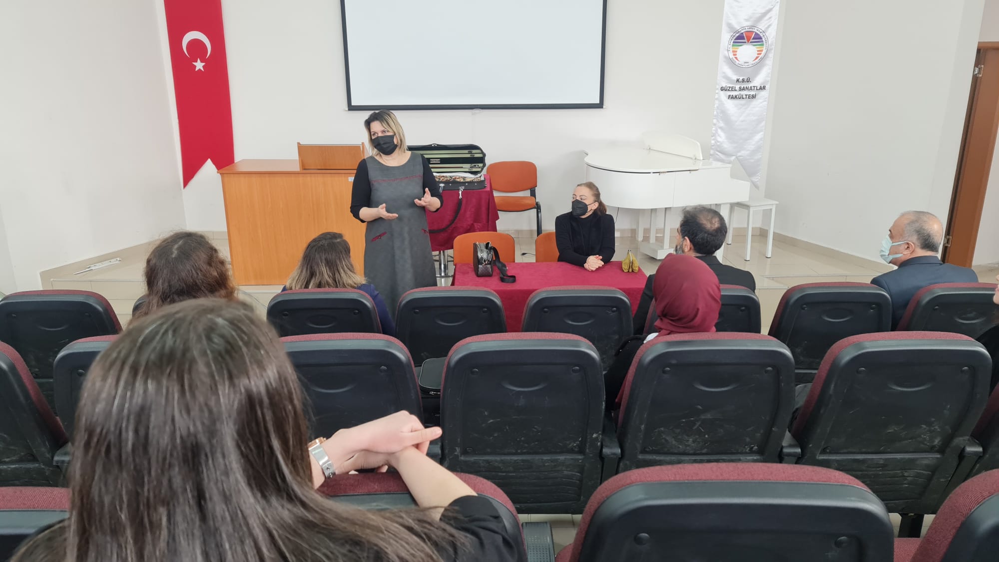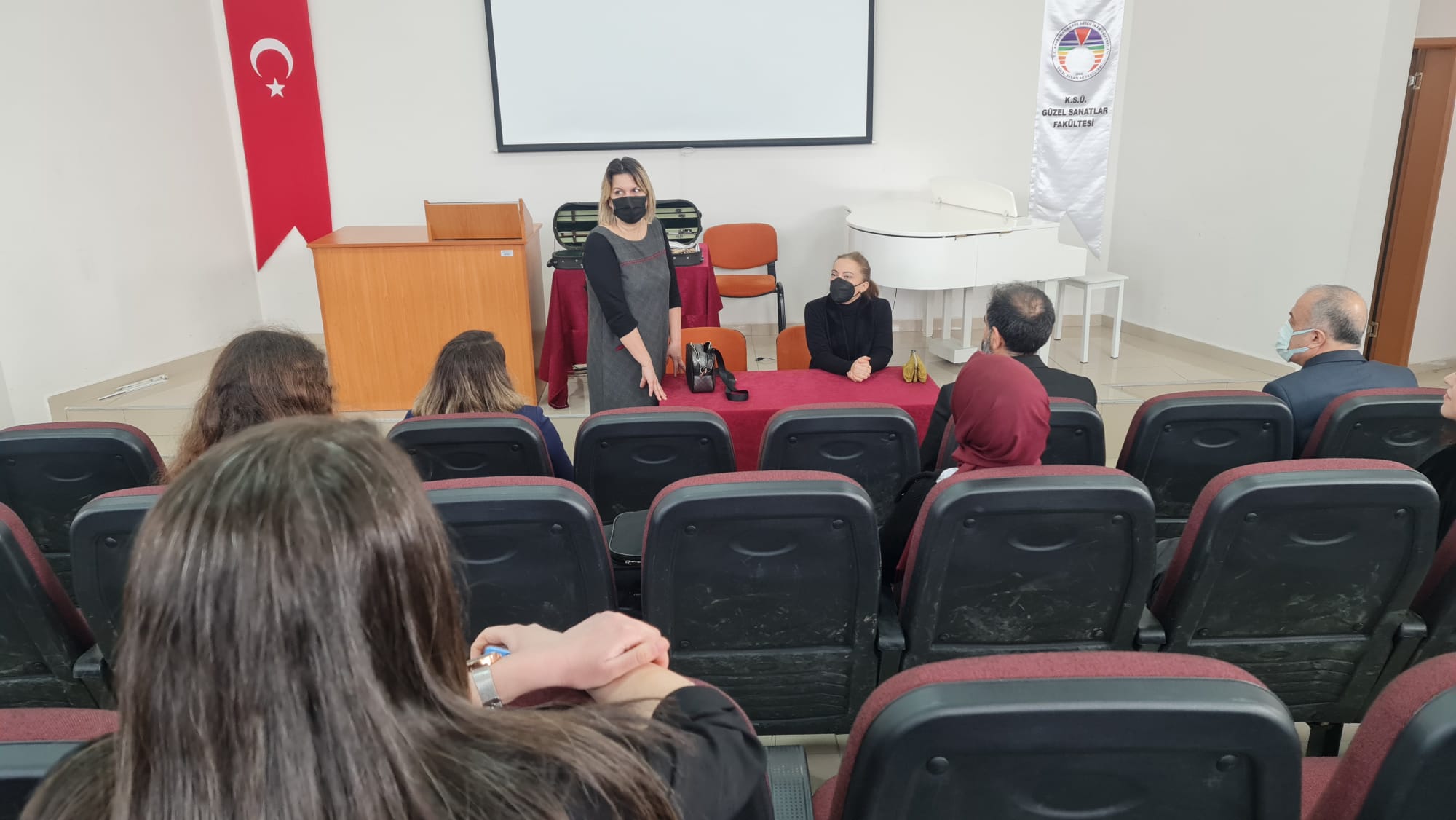 Cumhurbaşkanlığı Senfoni Orkestrası (CSO) İlk Kadın Başkemancısı Doç. Dr. Jülide YALÇIN ve Piyanist Doç. Dr. Elif ÖNAL Güzel Sanatlar Fakültesi Müzik Bölümü öğrencileri ile Söyleşi ve Workshop etkinliğinde bir araya geldi. 07 Mart 2022 Pazartesi günü düzenlenen etkinlikte öğrencilerimizin sorularını cevaplayan YALÇIN ve ÖNAL, ardından öğrencilerimiz ile workshop gerçekleştirdi. Etkinlik sonunda Güzel Sanatlar Fakültesi Dekanı Prof. Dr. Mehmet ÖZKARCI tarafından kendilerine teşekkür belgesi takdim edildi.