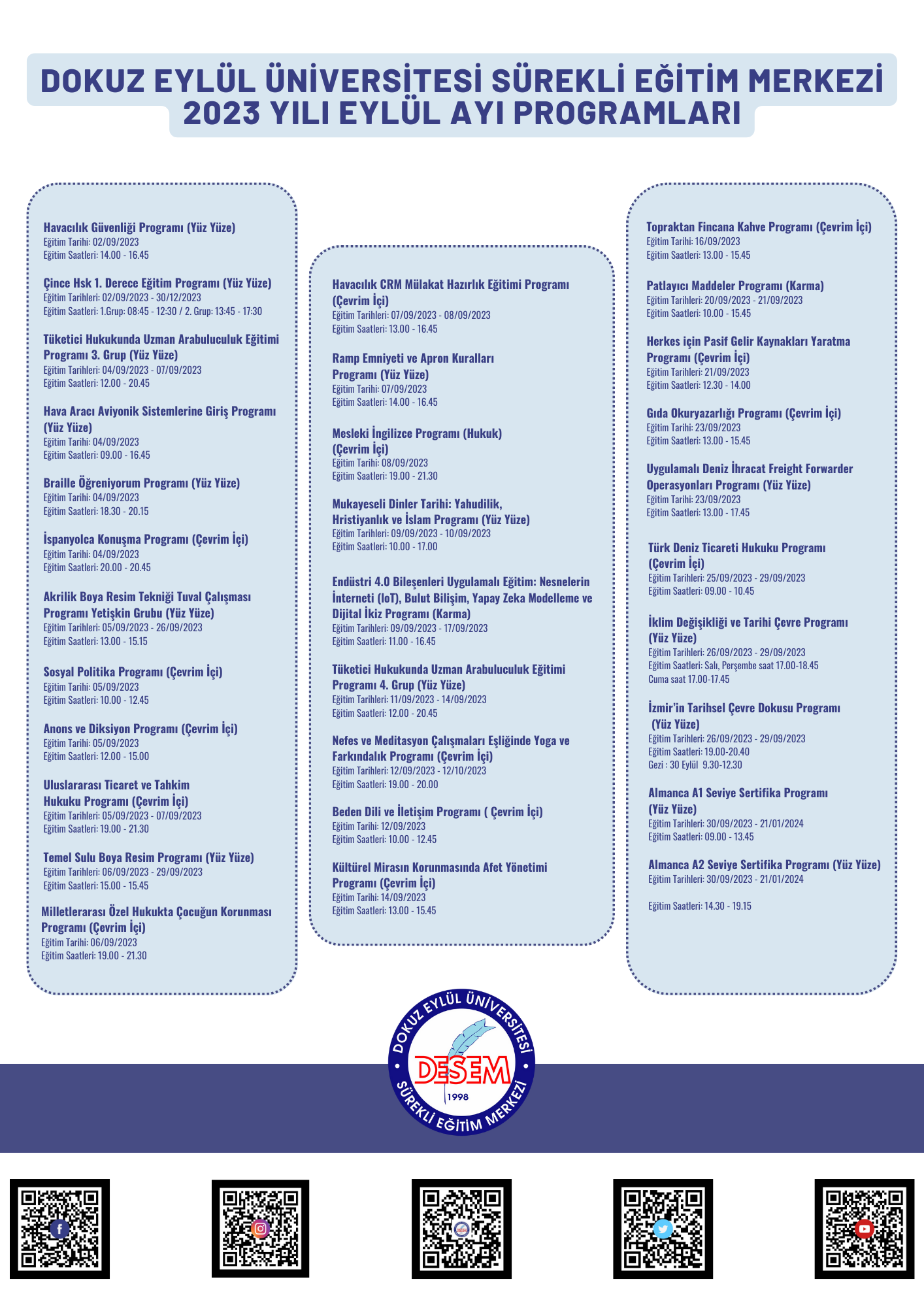Dokuz Eylül Üniversitesi Sürekli Eğitim Merkezi 2023 Yılı Eylül Ayı Programları