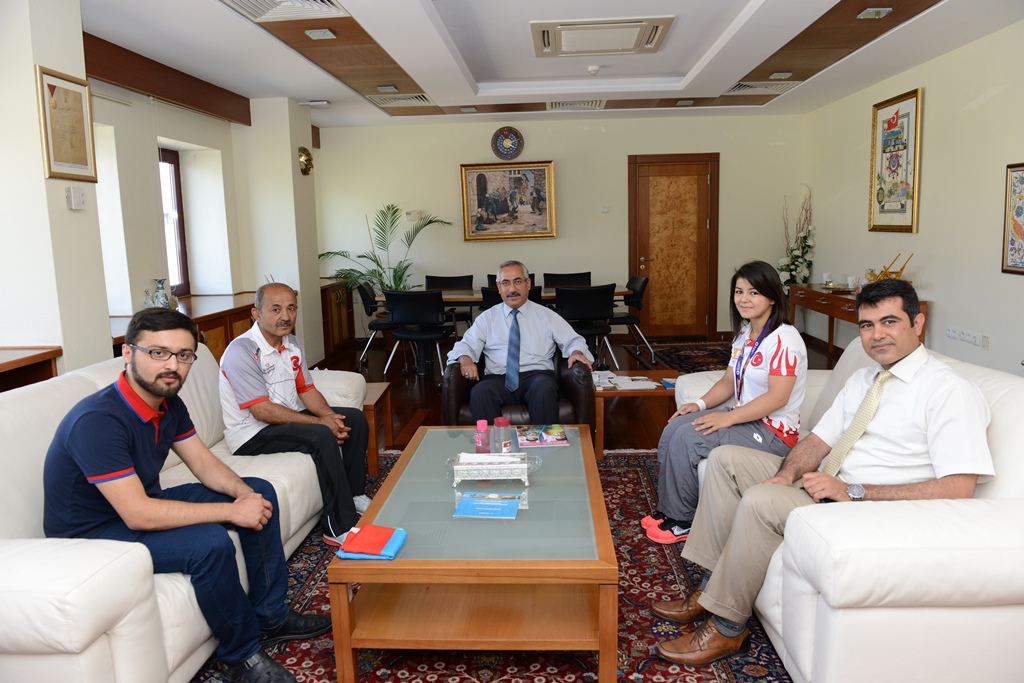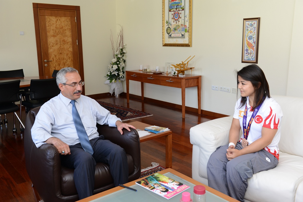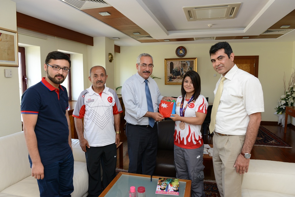 Avrupa Oyunlarında bayrağımızı dalgalandıran Üniversitemiz öğrencisi Merve Kenger, Rektör Prof. Dr. Durmuş Deveci’yi makamında ziyaret etti.