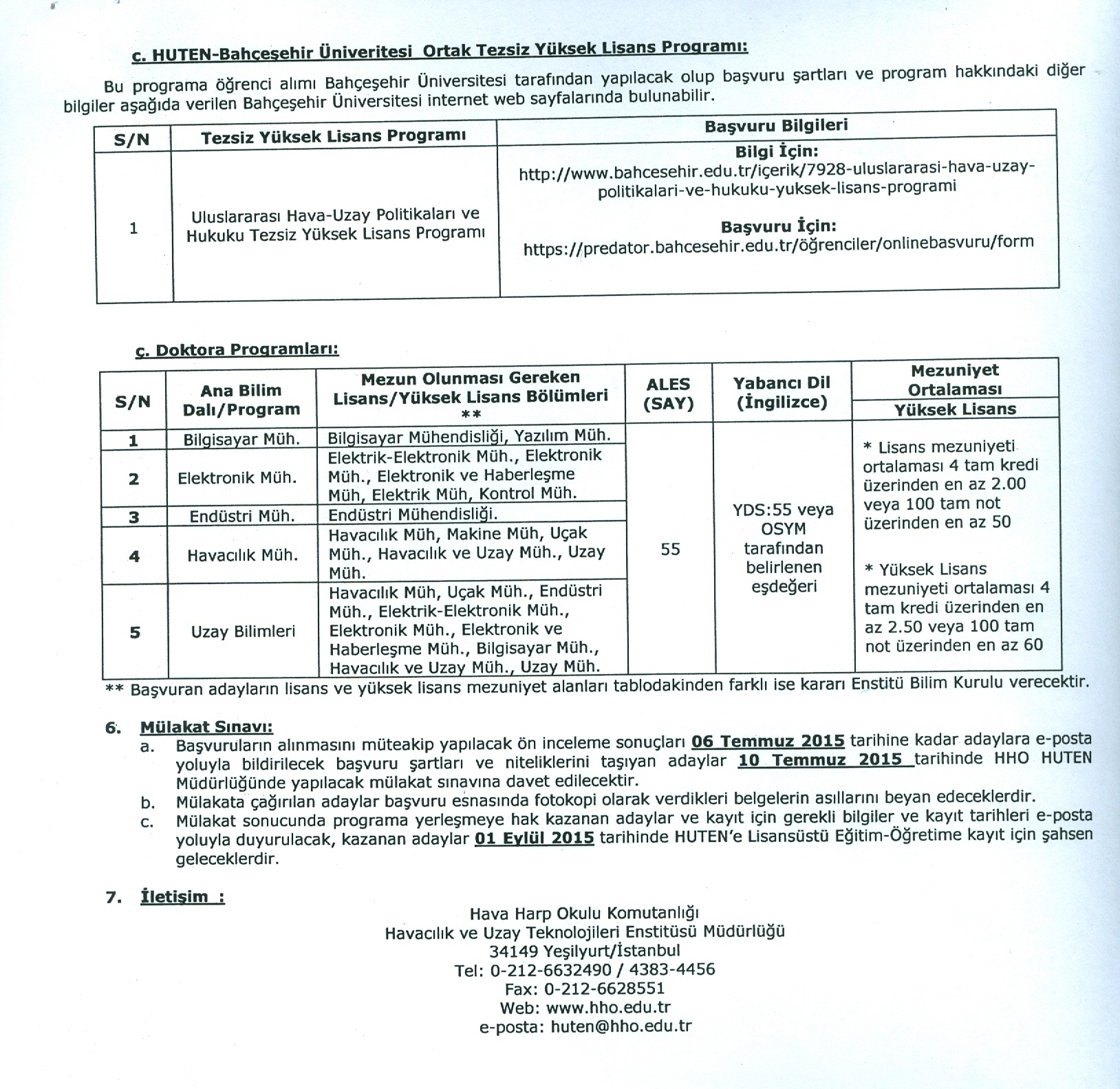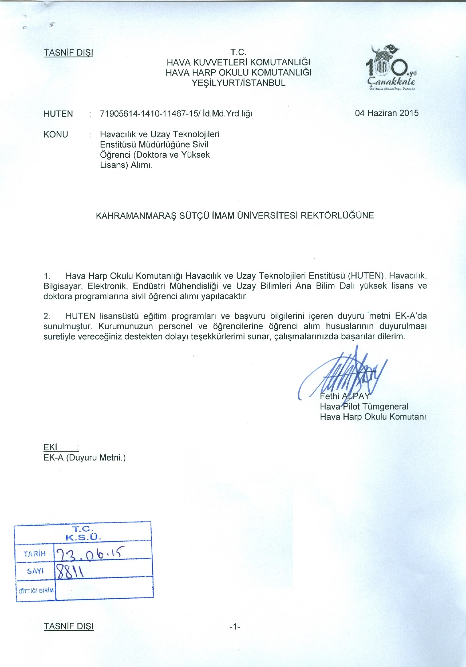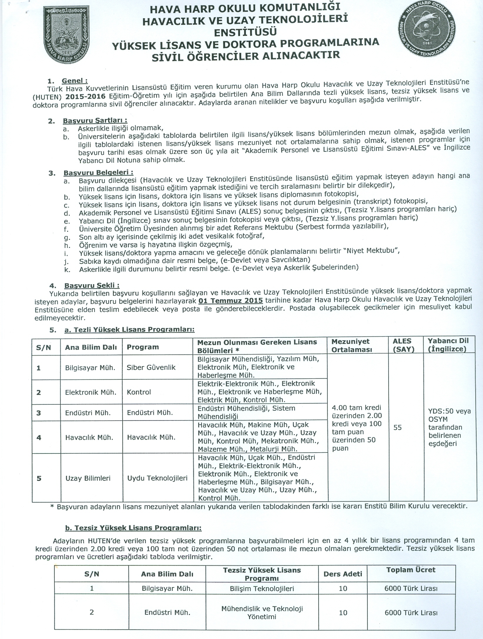 Hava Kuvvetleri Komutanlığı Duyurusu: "Havacılık ve Uzay Teknolojileri Enstitüsü Müdürlüğüne Sivil Öğrenci (Doktora ve Yüksek Lisans) Alımı