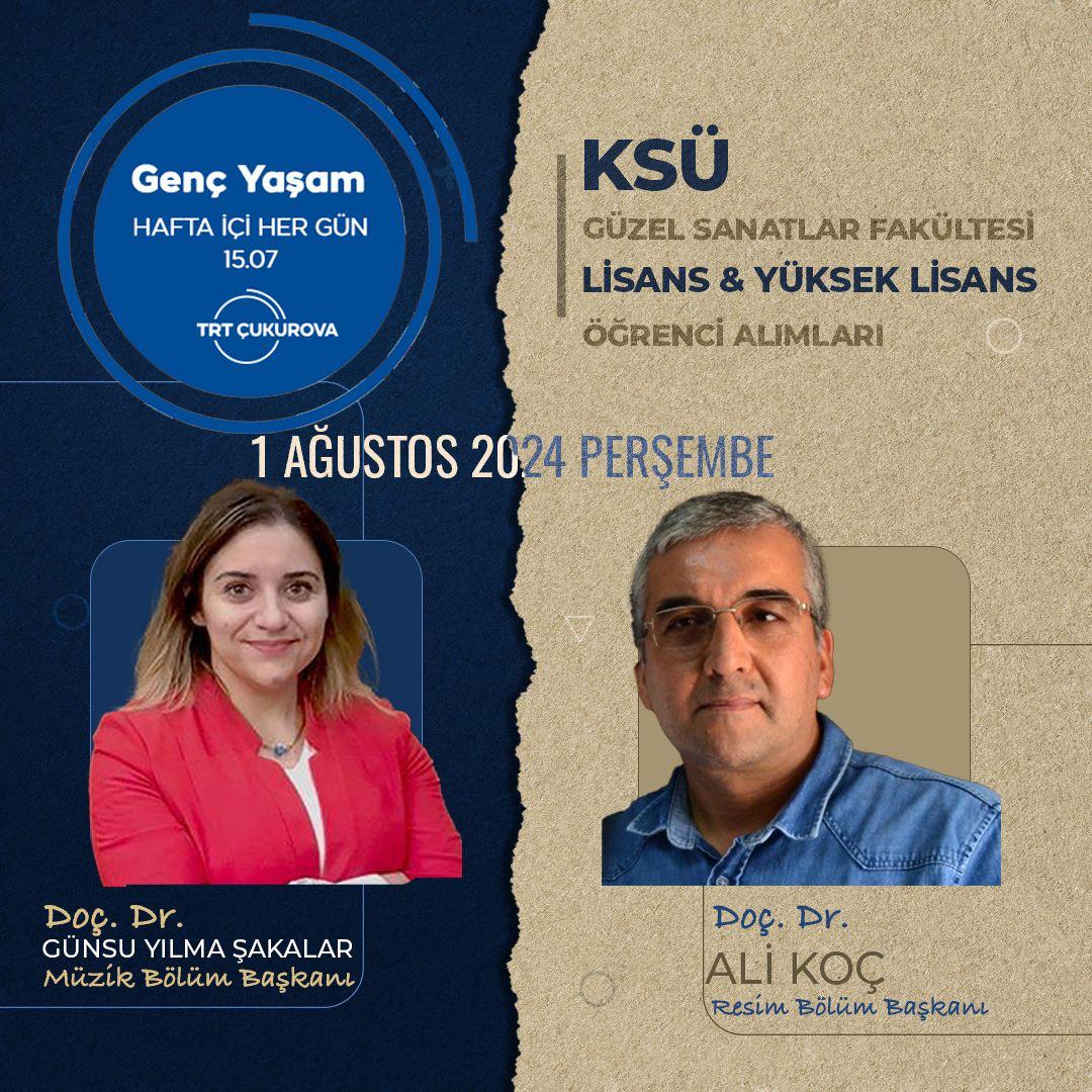 Kahramanmaraş Sütçü İmam Üniversitesi (KSÜ) Güzel Sanatlar Fakültesi (GSF) Resim Bölüm Başkanı Doç. Dr. Ali KOÇ ve Müzik Bölüm Başkanı Doç. Dr. Günsu YILMA ŞAKALAR, 2024-2025 akademik yılı özel yetenek sınavları ve KSÜ Sosyal Bilimler Enstitüsü yüksek lisans öğrenci alımları hakkında TRT Çukurova Radyosu’nda yayınlanan Genç Yaşam programına katıldı. Programda, bölümlerin tanıtımları yapılarak öğrencilerin yeteneklerini geliştirebilecekleri alanlar, sunulan eğitim olanakları ve Fakültenin eğitim kalitesi hakkında bilgi verildi. Özellikle, özel yetenek sınavlarıyla ilgili detaylı bilgiler paylaşıldı. Sınav başvuru koşulları, süreci ve değerlendirme kriterleri açıklandı.