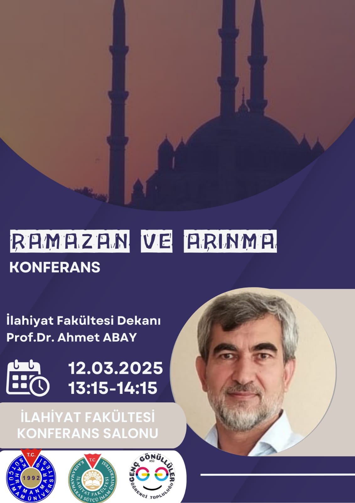 KSÜ İlahiyat Fakültesi Dekanı Prof. Dr. Ahmet ABAY tarafından Ramazan ve Arınma adlı konferans verilecektir
