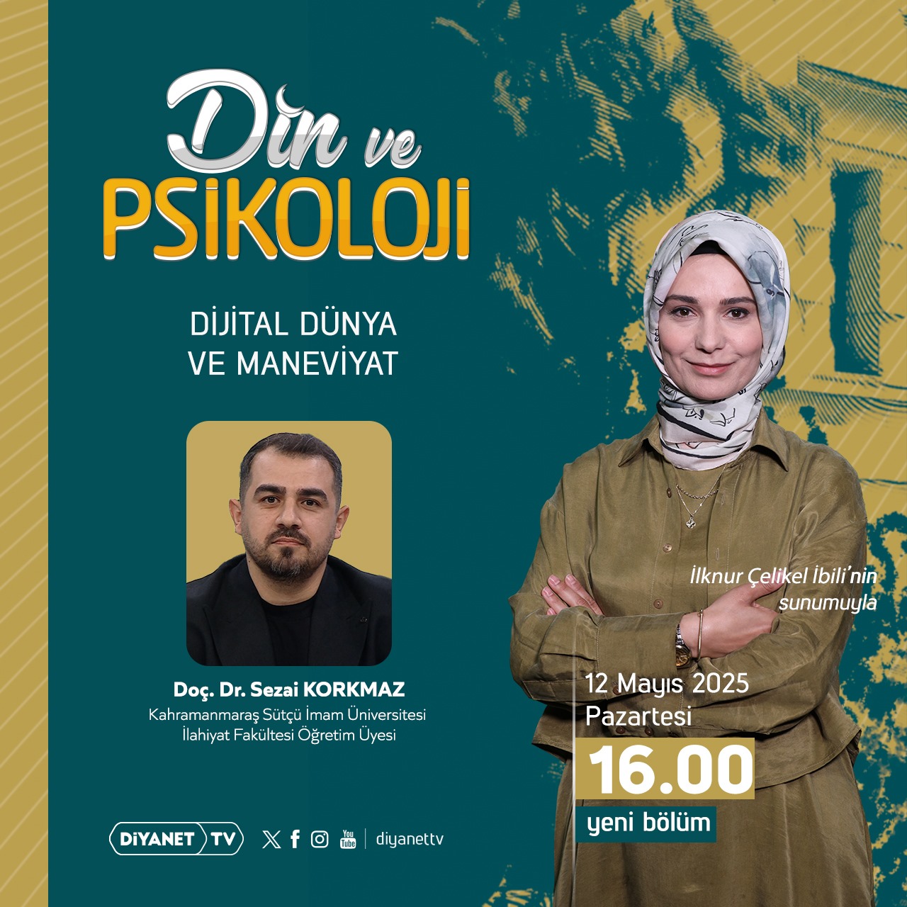Fakültemiz Din Psikolojisi Anabilim Dalı Öğretim Üyesi Doç. Dr. Sezai KORKMAZ Diyanet TV de Dijital Dünya ve Maneviyet konulu programa 12 Mayıs 2025 saat 16:00 da konuk olarak katılacaktır.